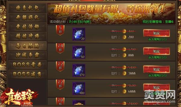 然后就是每日限购。因为小编刚刚也说了,《真龙主宰》新区开服第六天最重要的就是精练,所以为了更好地提升大家装备的精炼值,每日限购里便含有大量的精炼石。小编建议兄弟们把每日限购里的精炼石全部都买完,毕竟消耗的传奇币并不多。并且在这一天将开放精炼冲榜,不过精炼多高全凭个人运气,小编只能说先把精炼等级提上来,能提多高就提多高。精炼对兄弟们的战力加成是十分高的,所以精炼冲榜也是拉开实力的一个重要榜单,如果兄弟们对冲榜有执念的话,可以购买千年玉冲榜哦。