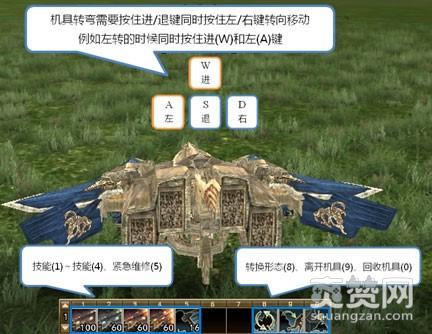 1. 登入机具后技能快捷栏将切换为驾驶状态,包含制式弹药攻击、特制弹药攻击(多种技能)、紧急维修、转换形态(需要支持转换形态的机具)、离开机具、回收机具功能。