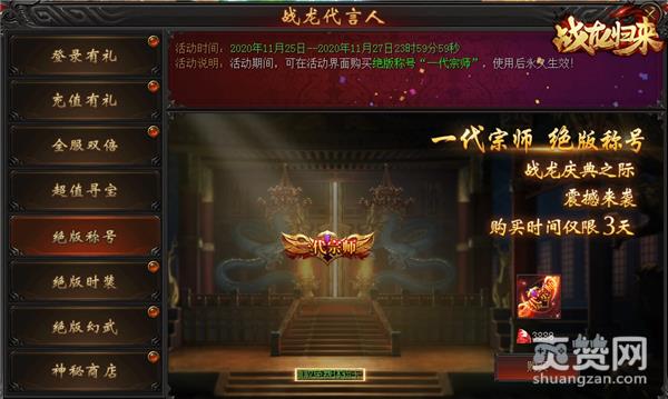 活动期间,玩家可在活动界面购买绝版称号“一代宗师”,使用后永久生效。不论是叶问还是甄子丹本人都是一个时代的一代宗师。如今“一代宗师”的称号即将降临战龙大陆,战龙里的一代宗师会是你吗?