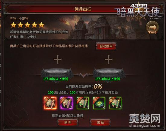 佣兵出征时,还可以携带自己的坐骑或者宠物协助,只要派遣的坐骑或者宠物达到指定要求,即有机会获得额外奖励。