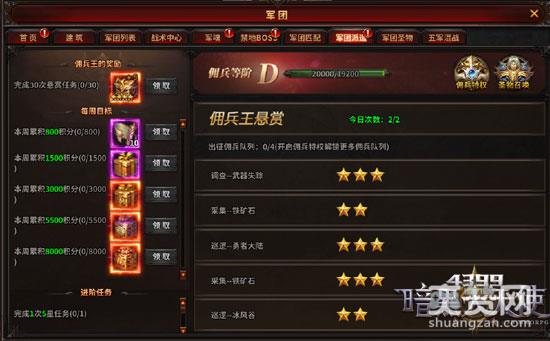每周目标:完成任意普通派遣任务和悬赏任务都可获得佣兵积分,只要佣兵积分达到指定档次,即可以领取对应的档次奖励,佣兵积分和领奖状态每周一0点重置。