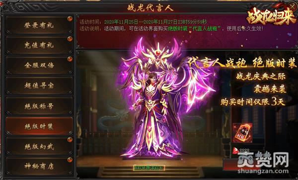 活动期间,玩家可在活动界面购买绝版时装“代言人战袍”,使用后永久生效。紫色战袍极具魅力,散发着幽寂的气场,如同苍鹰一般凌厉。穿上他,你也会和我们《战龙归来》的代言人甄子丹一样,称王称霸!