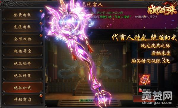 活动期间,玩家可在活动界面购买绝版幻武“代言人神武”,使用后永久生效。紫色神武被紫色光晕所包围,充满着高贵的气息,如同宣誓它的主人神圣而不可侵犯。手持代言人神武,你也能和《战龙归来》代言人甄子丹一样,一个打十个!