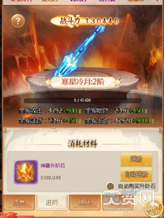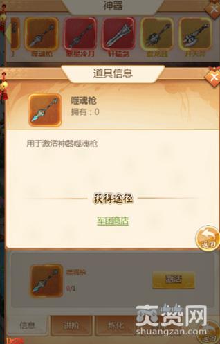 神器进阶会提高全军的攻击-法防-物防-生命,等级越高神器的技能效果则越高。进阶道具可以道具商城直接购买,或日常副本中挑战获得。