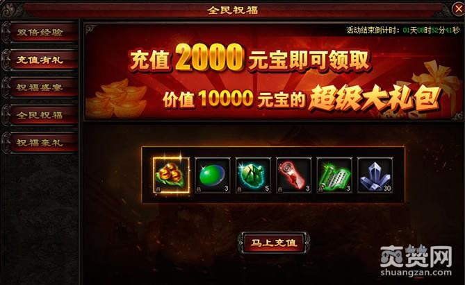 活动内容:活动期间,每天充值达到2000元宝即可领取对应礼包奖励