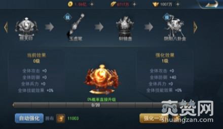点击界面下方的强化按钮,可进行宝物强化。强化宝物需消耗铜雀令,每成功强化一次均会提升强化进度。强化进度每达成一个刻度,即可获得属性提升。