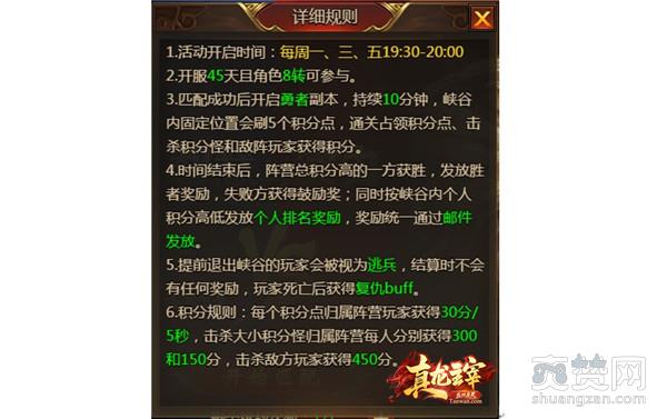 1、玩家通过匹配进入勇者峡谷,时间持续10分钟,峡谷内固定位置会刷5个积分点,通关占领积分点、击杀积分怪和敌阵玩家获得积分