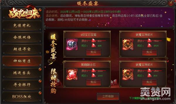 活动期间,神秘商店将倾情促销破魔宝珠碎片、战龙融合石等,除此之外还有其他各式各样的稀有材料!商店物品每2小时自动刷新(或全商品全部已购后),另外消耗199龙钻也可手动刷新。