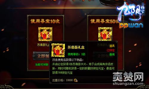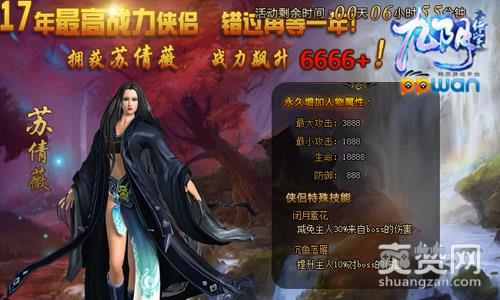 众所周知,女神苏倩薇是ppwan《九阴绝学》的代言人,化身侠侣陪玩家一起闯荡江湖,想想就很激动!拥有了绝版侠侣苏倩薇,可增加最大攻击3888,最小攻击1888,生命18888,防御888,还拥有侠侣特殊技能闭月羞花和沉鱼落雁,史上绝无仅有的侠侣战力之最,你还等什么呢?赶紧在限定的时间寻宝吧!