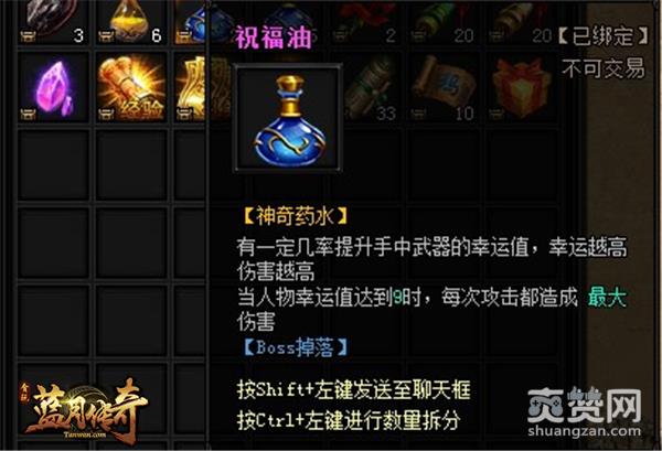 祝福油是一种神奇药水,有一定几率能提升手中武器的幸运值,玩家可祝福角色武器,也可祝福英雄武器。武器的初始祝福值为0。当武器的幸运值越高时,伤害也越高。而当人物幸运值达到9时,每次攻击都能获得极大的伤害。祝福油可以到商城内去购买,打BOSS时也会有机会掉落。