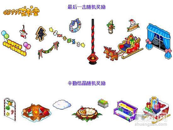 7、最后一击消灭北极老头的玩家可获得一个随机奖励(圣诞快乐气球、圣诞火炉长烟囱、雪松彩灯挂饰、星星雪人挂饰、圣诞老人门牌、蓝色蝴蝶雪花环、木质松树窗、圣诞雪橇车、圣诞夜景窗、雪松竹筒灯、星星糖果挂饰)。