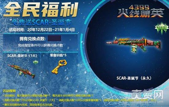 过圣诞节有什么比收礼物更让人开心的事情呢?《4399火线精英》全民福利大派送,圣诞节专属武器“SCAR-圣诞”免费得!这个圣诞祝福是不是特别有诚意呢?快来领取吧!