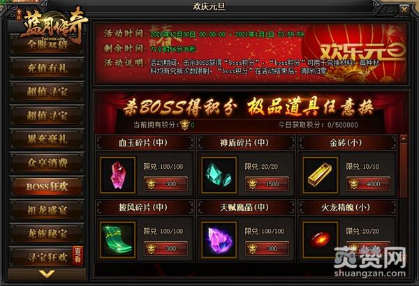 活动期间内,玩家击杀BOSS获得“boss积分”,“boss积分”可用于兑换各种稀有材料。每种材料均有兑换次数限制,“boss积分”在活动结束后,清除归零,记得及时兑换。