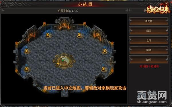 玩家转生达到6转即可在“六道轮回”处,通过与NPC“非天”对话进入“六道轮回”地图。当进入圣域后,玩家可从“玄”、“生”、“破”、“虚”、“妄”、“灭”六门中任选其一进入,每个门又各有六条通道六条通道中只有一条可以通往下一层圣域,其余五条通道玩家会遭遇“BOSS”、“变异BOSS”、“圣域BOSS”的袭击,凶险万分。