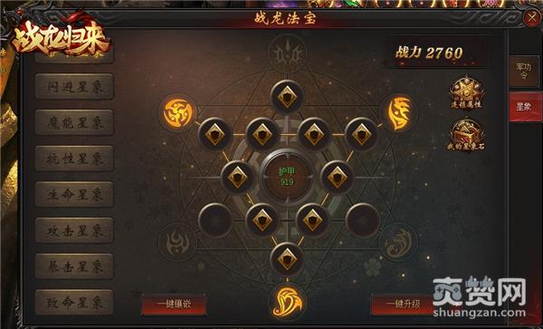 在“战龙法宝-星象”界面穿戴星象石可全面增加属性,一共有8个不同星象,高级星象石由两颗相同的低一级星象石合成,激活星象盘的连锁属性可获得大量属性加成,激活连锁属性的星象石等级越高连锁属性等级越高,获得的属性增幅越强。