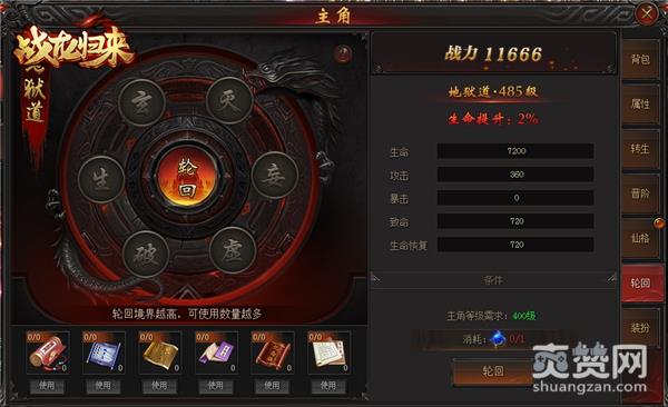 在“角色-轮回”界面修炼轮回心法,轮回六道依次为地狱道、饿鬼道、畜生道、修罗道、人间道和天道,每道又分位玄境、生境、破镜、虚境、妄境、灭境。主角和英雄的等级达到六重境界时,可使用“轮回丹”提升境界。轮回境界越高,轮回心法使用上限越高。主角或英雄修炼到灭境时,即可使用“【无上】轮回令”突破至下一轮回的150级。突破轮回不仅可以获得大量属性,更可以使用轮回心法加成轮回属性。轮回丹和轮回令可在黑市购买。