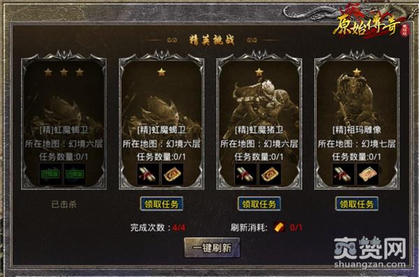精英挑战每次随机刷新四个不同星级的任务,这里小编强烈建议一定要刷三星任务去做,因为只有三星任务才能获得以上提到的“玉佩试炼”和“法阵试炼”的门票,同时会附送一个传奇币宝箱,每个箱子可以获得3000传奇币,相当划算。