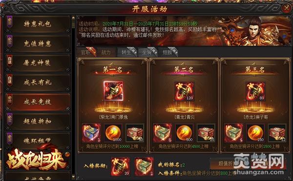 入榜条件:角色坐骑评分达到800。奖励:战龙神装碎片*20、Ⅰ阶坐骑装备宝箱*2