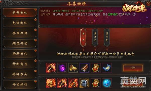活动期间,玩家每日登录游戏可领取奖励,礼包包括秘宝钥匙、荣誉令、离火双倍卷轴等,而激活至尊特权还可额外领取一份!内含价值1000龙钻的宝物自选宝箱!