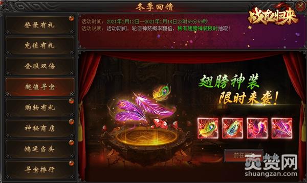 活动期间,轮回神装概率翻倍,翅膀神装限时抽取!没有一双好的翅膀如何能在战龙大陆自由自在地翱翔呢?喜欢的兄弟千万不要错过了呀。
