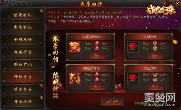 活动期间,神秘商店倾情促销稀有材料!商店物品每2小时自动刷新(或全商品全部已购后),消耗199龙钻可手动刷新。