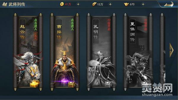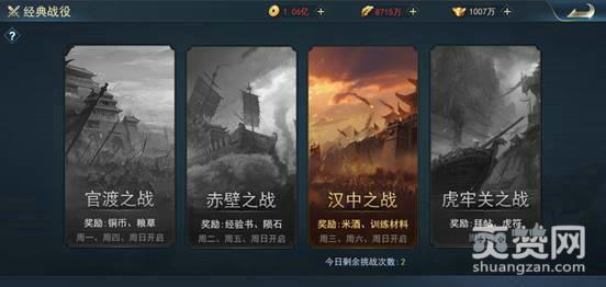 你还可以挑战三国历史上的经典战役,如果是你,能否改写历史,或者成为新的传奇?游戏中开放了官渡之战、汉中之战、赤壁之战、虎牢关之战四场战役,每场战役均只能出战指定国家的武将。挑战成功后还可获得丰厚资源奖励!