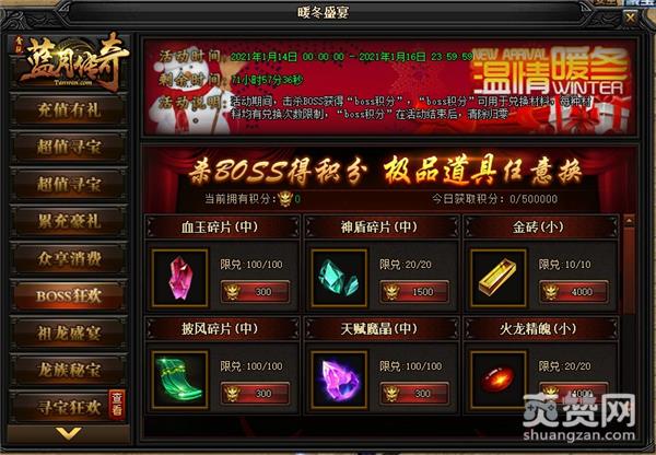 活动期间内,玩家击杀BOSS获得“boss积分”,“boss积分”可用于兑换各种稀有材料。每种材料均有兑换次数限制,“boss积分”在活动结束后,清除归零,记得及时兑换。