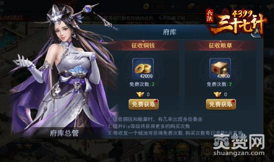 在府库中可征收铜钱与粮草,每成功收复一个城池,即可获得1次免费征收的次数,征收时还有一定几率使获得的资源翻2-3倍。免费征收次数耗尽之后,还可以消耗元宝进行征收。值得注意的是,游戏中会在固定的日期开放府库双倍活动,此时征收可获得双倍资源。