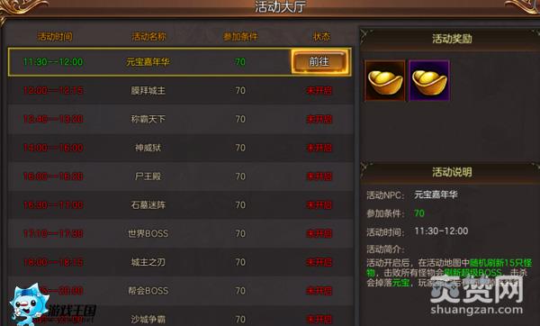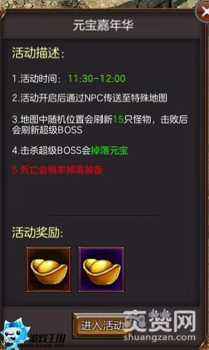 活动开启后,玩家可通过活动界面点击“元宝嘉年华”后的“前往”即可传送到NPC处,或者走到盟重土城中的“元宝嘉年华”NPC处参与活动;