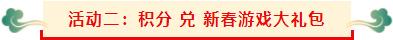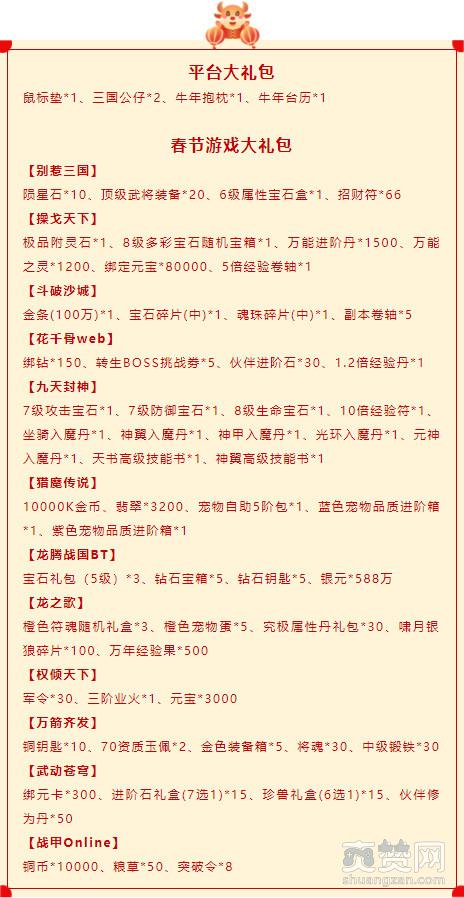 转盘奖励:平台大礼包、牛年抱枕、500平台币、88平台币、双飞燕-血手幽灵机械键盘、春节游戏大礼包(价值¥300-500)、代金券(满100元返100平台币)、代金券(满1000返1500平台币)、代金券(满5000返10000平台币)