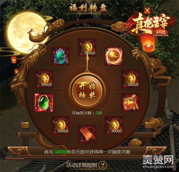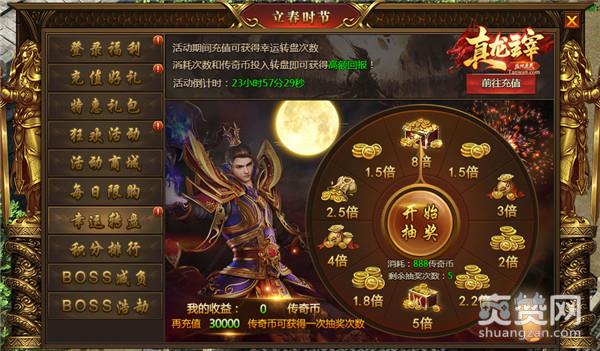 活动期间充值可获得转盘次数,拥有次数时参与传奇币转动转盘可获得倍数返利。最低1.5倍,最高8倍的传奇币返还,你心动了吗?