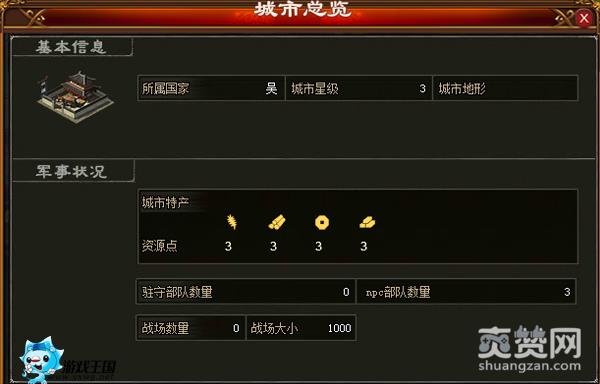 在游戏中,世界地图里的城池是有等级之分的。城池等级越高,攻占的难度越大,不过相应的占领后可得的功勋就越多,缴获到高级战利品的几率也越大。除了有等级之分外,城池还有无资源点的区别。有资源点就表示该城池有产出资源,而无资源点的则相反。占领有资源点的城池后,主公在占领期间都可以获取城池产出的资源。