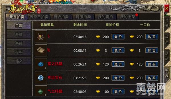 1.元宝拍卖:上架与竞拍的拍品都是以元宝进行交易的,通常里面的拍品都是价值较高的装备和材料。