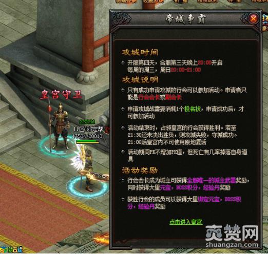 此时攻城和守城的玩家进入皇宫场景内进行厮杀,PK不增加PK值,死亡几率掉落装备