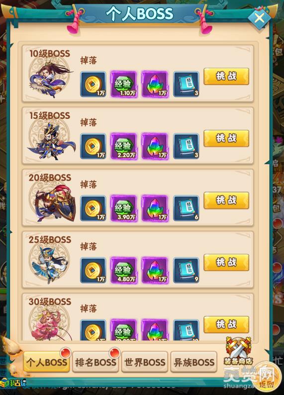 当主角达到10级时会开启个人BOSS,个人BOSS是每天获取经验的稳定来源,每个BOSS获得的经验值都固定,每天上线可以优先把所有能打的BOSS挑战或扫荡一遍,如果是大R级的,可以用元宝把每个BOSS的扫荡次数都扫荡完,这样能比别人多获得2轮的经验值。