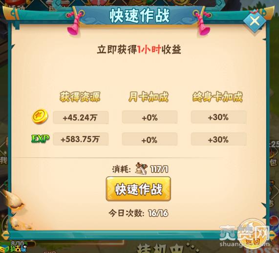 当主角达到7级时会开启快速作战,消耗快速作战卷或者元宝可以获得大量金币和经验值,快速作战前期推荐在每天把其余获取经验的途径都清完后,再使用快速作战升级,后期由于升级需要的经验值太多,快速作战可以在,还差1点就升级的情况下使用。