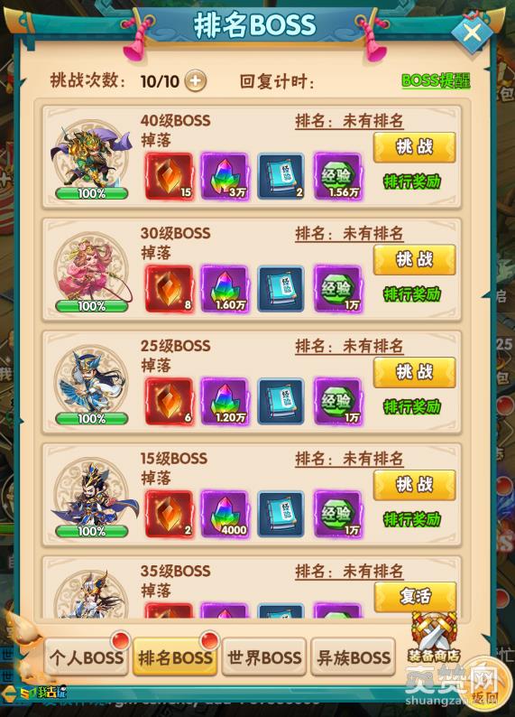 当主角等级达到12级时会开启排名BOSS,排名BOSS每次挑战都会消耗挑战次数,当挑战次数不足10次时,每过1小时就会回复1次挑战次数,挑战排名BOSS时伤害越高,排名就越高,获得的奖励就越丰厚。