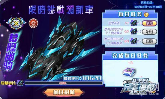 02月25日—03月10日期间,限时挑战可获得“幕隐碎片”。“幕隐碎片”可用于进阶全新X车——幕隐幽骑。