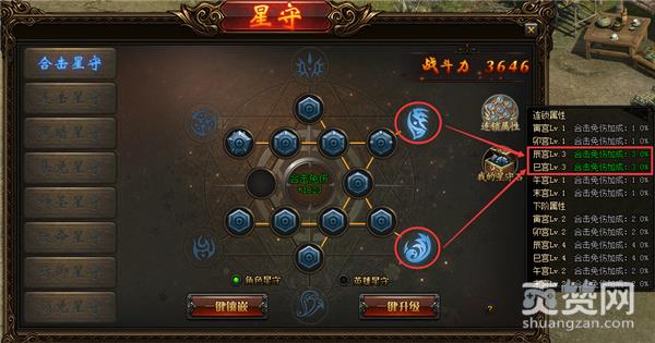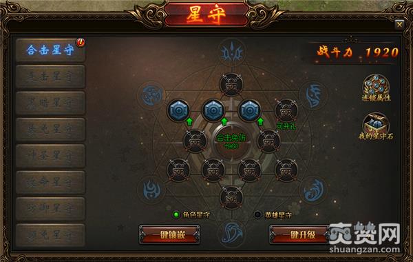 两颗低级星守石可合成高一级的星守石,最高可升至10级。星守盘6个顶点分别有六条连锁属性,任意顶点延伸出的两条线穿戴满星守石则可激活连锁属性。星守石整体等级越高,则连锁属性等级越高,获得的属性增幅越强。想镶嵌更多的星守石,需要解锁星守孔,可在商城购买解锁道具“星守开孔石”。