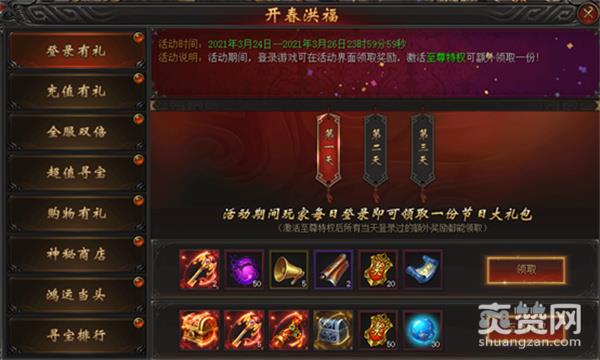 活动期间,玩家每日登录游戏可领取奖励,礼包包括秘宝钥匙、荣誉令、离火双倍卷轴等,而激活至尊特权还可额外领取一份!内含价值1000龙钻的宝物自选宝箱!
