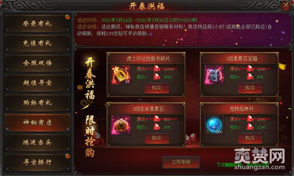 活动期间,神秘商店倾情促销稀有材料!商店物品每2小时自动刷新(或全商品全部已购后),消耗199龙钻可手动刷新。