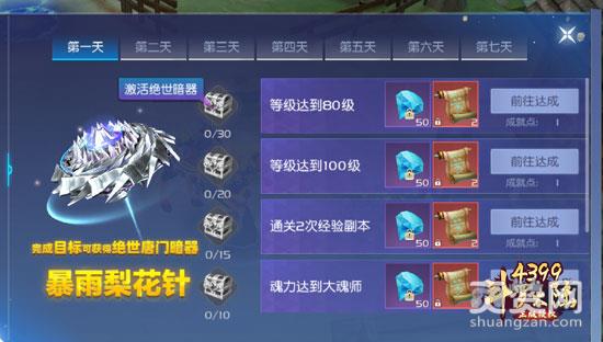 活动内容:开服之后,玩家完成指定任务获得成就点,利用成就点打开宝箱获取对应奖励,最终激活绝世唐门暗器“暴雨梨花针”。