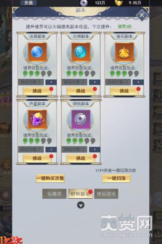 材料副本是整合了日常提升消耗的材料,分别有法身副本、元神副本、宝石副本、升星副本和铜钱副本。每个副本每天能挑战两次,如果玩家需要获取更多的材料,需要用元宝购买挑战次数。