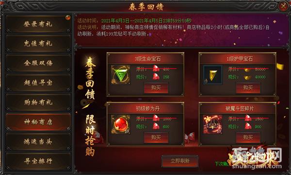 活动期间,神秘商店倾情促销稀有材料!商店物品每2小时自动刷新(或全商品全部已购后),消耗199龙钻可手动刷新。这些稀有材料平时的爆率可是很低的哦。有了这次机会就不用了花时间和精力苦苦寻觅了!不过因为是自动刷新,各位兄弟可千万记得来看一看有没有需要的材料,要是被刷走了可就太亏了呀。