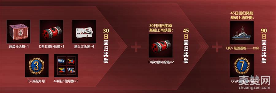 虽然这次联动是从“心”出发的冒险,但针对老兵回归的奖励也是很丰厚的哟!超过30日以上未参与任何战斗的玩家,根据离开时长可以凭码兑换不同的奖励,除了超级补给箱、高级账号、信号旗之外,最高可免费领取F系5级驱逐舰“热风”,错过了年初不要紧,回归好礼助你雄风再起。