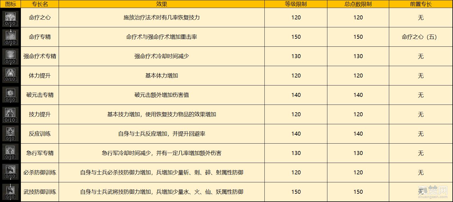 在谋士的众多专长中,比较重要的有“命疗专精”、“技力提升”、“必杀防御训练”和“武技防御训练”这四个专长。“命疗专精”可以提升命疗术和强命疗术的重击率,大大提高了谋士的生命值回复量。“技力提升”则可以增加谋士的基本技力,还能增加恢复技力物品的效果,是谋士的核心专长之一。“必杀训练防御”和“武技训练防御”可以提升自身和士兵的必杀技防御力和武将计防御力,并且可以增加少量的属性防御。