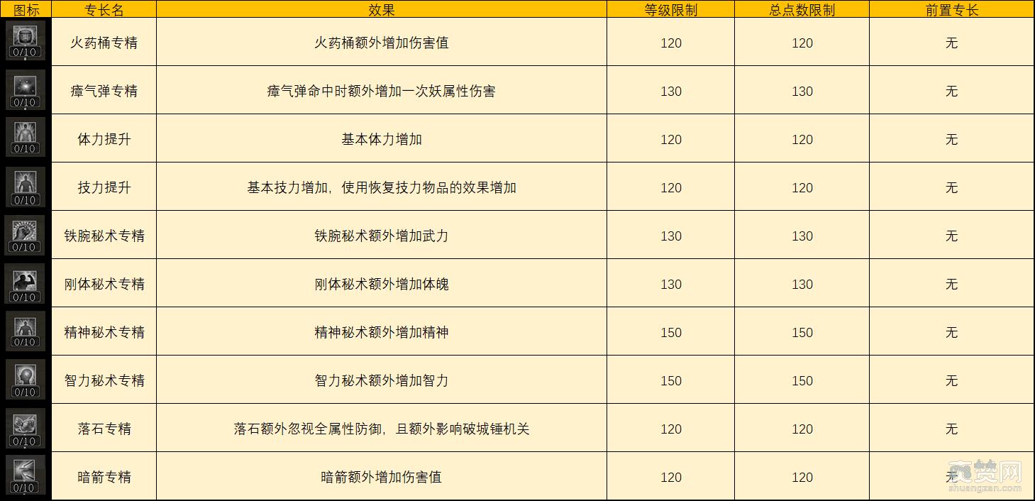 博士比较重要的专长是“瘴气弹专精”、“技力提升”、“落石专精”这三大专长。“瘴气弹专精”可在命中目标时额外附加一次妖属性伤害,加强了博士的输出能力,“技力提升”可以增加基本技力,并增加恢复技力物品的效果,是博士的核心专长之一。“落石专精”可以提供忽视全属性防御的效果,并且能够影响到破城锤机关,在国战中作用巨大。