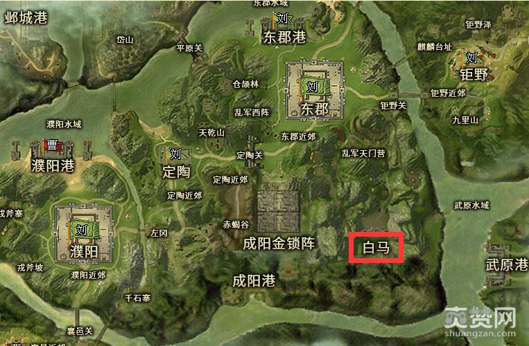 白马位于地图上的兖州地区,东郡的右下方,作为一个需切换场景的独立地图,亭台楼阁,宫殿城门一应俱全。在地图尽头的白马将军府中,白马将军“公孙瓒”连同追随他的“赵云”一起坐镇于此,静待着入侵此地之人的挑战。白马将军府出现的三位Boss中,“公孙瓒”和“赵云”的身份是世界王,而“公孙越”作为精英轮播王的实力也不低,需要玩家们额外小心。