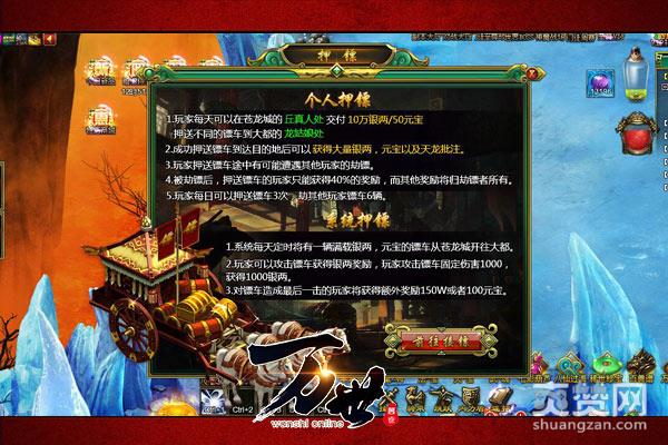 珍贵的宝物总是会引起多方的觊觎,尤其是运载着价值不菲的宝物的镖车,每每都会引起盗匪的注意。在大黑《万世》中,当你在丘真人处接取镖车后,便可守护镖车送至位于大都的龙姑娘处。实力保护镖车,打败抢夺之人,当你安全护送镖车后,即可获得丰厚的财富、珍宝等奖励。