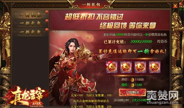 重磅来袭,终极回馈,超级礼包,一级折扣,哇,这次是真的给大家放送了豪华礼品一折豪华礼包,只要满足充值条件就可以花原价的一折购买稀有物品,豪华修为丹让你提升更高的境界,战力疯狂增加!限定至炎特戒,在PK的时候直接无视对方的防御,真是神来之戒啊!还有技能藏品豪礼,修为丹等。主要是只要花平常原价的一折购买,而且有些还是限定的礼物,这诱惑让小编都受宠若惊,还等什么快来体验吧!